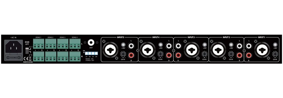 Предварительный стереоусилитель-микшер 5:4 с SD MMC/USB и FM-тюнером, Входы 5 Mic/Line (2хRCA + XLR/Jack 6,3 мм) с фантомным питанием 18 В.