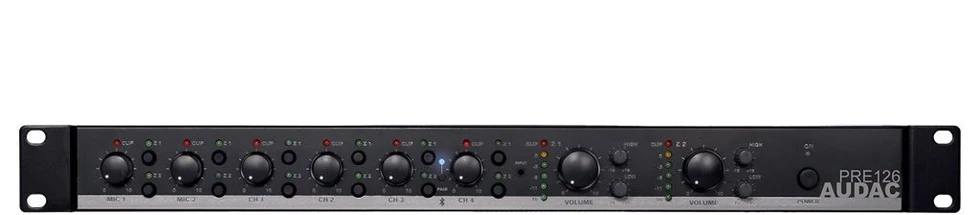 Предварительный стереоусилитель-микшер 6:2, Входы: 2 х XLR (15 В), 1 х (2 х XLR), 3 x (2 x RCA) с приемником Bluetooth и входом стереоаудио (miniJack 3,5 мм).