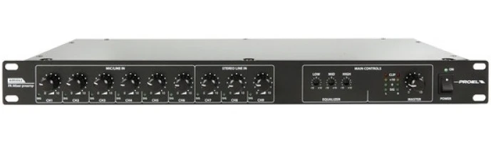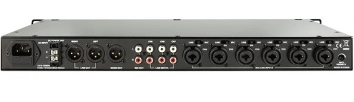 Предварительный стереоусилитель-микшер 9:1. Входы 6 Mic/Line (XLR) с фантомным питанием 16–19 В, 1х (2хXLR), Line 3x (2xRCA). Выход стереоаудио (XLR). Mic1 приоритетный. Вход пожарной сигнализации. Монтаж в стойку.