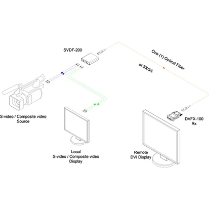 Преобразователь интерфейсов CV, S-Video в DVI-D со встроенным передатчиком по одному многомодовому оптоволоконному кабелю на расстояние до 500 м (совместимый приемник: DVFX-100-R).