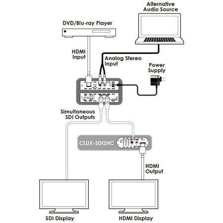 Преобразователь сигнала HDMI 1080p/60 c EDID и аудиостерео (2хRCA) в 2 сигнала SD/HD/3G-SDI (BNC).