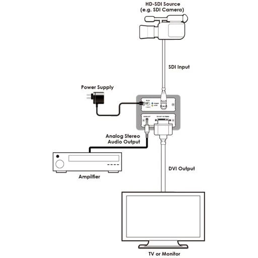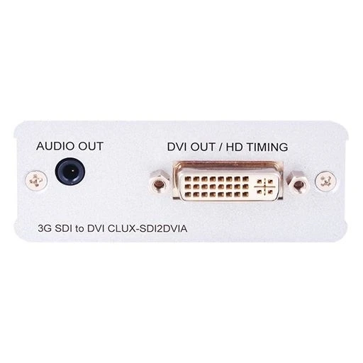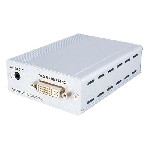 Преобразователь сигнала SD/HD/3G-SDI (BNC) в формат DVI-D (до 576i для SD, 1080i для HD, 1080p для 3G-SDI) и стереоаудио (miniJack 3,5 мм), расстояние приема 300 м для SD, 200 м для HD, 100 м для 3G-SDI.