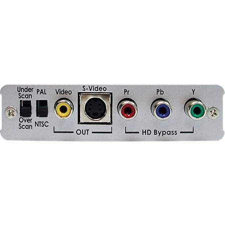 Преобразователь сигнала YPbPr (3хRCA) до 1080p/60 в CV (RCA), S-Video (mini-DIN4) PAL/NTSC с проходным выходом YPbPr (3хRCA).