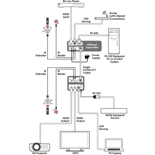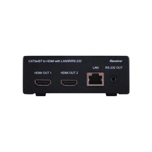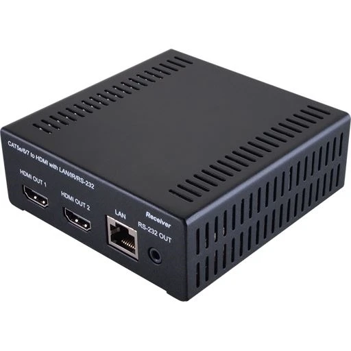 Приемник сигналов 2хHDMI 1.4 1080p/60 (4Kх2K, 3D) с HDCP и EDID, Ethernet (RJ45), ИК (2х miniJack 3,5 мм) и RS-232 (miniJack 3,5 мм) из витой пары CAT5e с PoC (Power over Cable), HDBaseT, расстояние приема до 100 м.