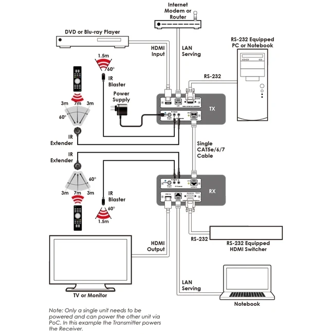 Приемник сигналов HDMI 1.4 1080p/60 (4Kх2K, 3D) с HDCP и CEC, Ethernet (RJ45), ИК (2х miniJack 3,5 мм) и RS-232 (D-sub-9) из витой пары CAT5e с двунаправленным PoC (Power over Cable), HDBaseT, расстояние приема до 100 м.