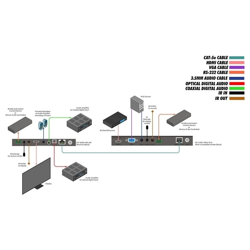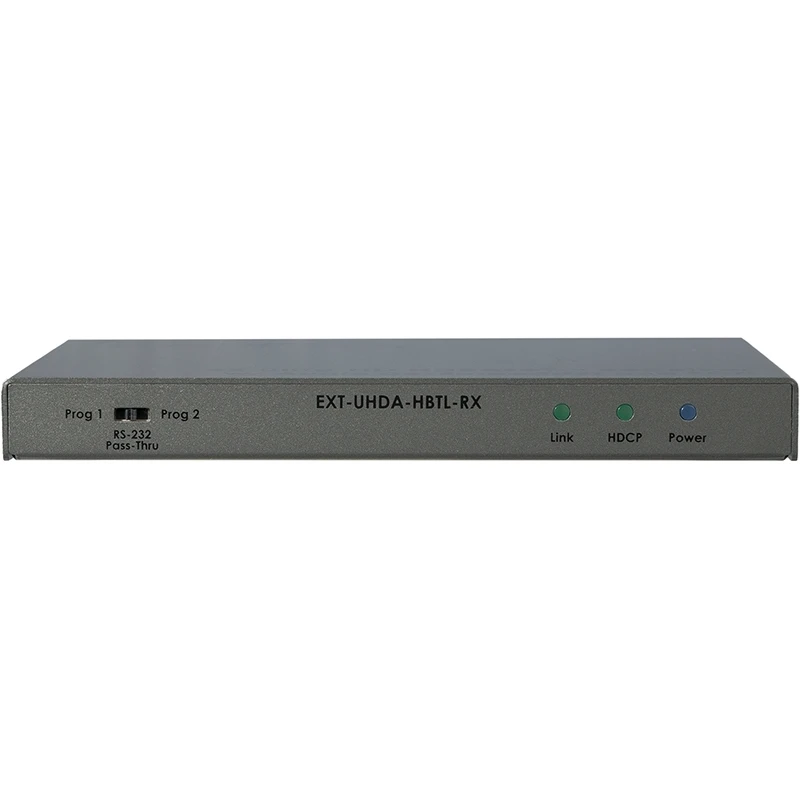Приемник сигналов HDMI 2.0 (4096x2160/30 при YUV 4:4:4, 3840x2160/60 при YUV 4:2:0, 3D) с HDCP 2.2/1.4, EDID и CEC, RS-232 (3-pin Phoenix), деэмбеддер аналогового стерео (miniJack 3,5 мм), цифрового S/PDIF (TOSLINK и RCA), двунаправленный ИК (2х miniJack 3,5 мм) из витой пары CAT5e с двунаправленным POH. HDBaseT 2.0, расстояние приема: 4K – до 40 м, 1080p – до 70 м, поддержка Syner-G.