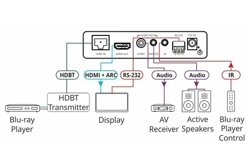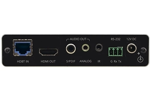 Приемник сигналов HDMI 2.0 4K60 (4:2:0) с HDCP 1.4, CEC и расширенным EDID, двунаправленного RS-232 (3-pin) и ИК (miniJack 3,5 мм) из витой пары HDBaseT с деэмбеддером цифрового аудио S/PDIF (RCA) и аналогового стерео (miniJack 3,5 мм), дальность 70 м (1080p/60) и 40 м (4K/60).