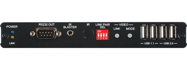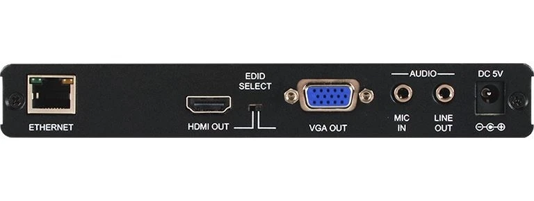 Приемник сигналов HDMI (YUV 4:4:4 – 4K2K/30, YUV 4:2:0 – 4K2K/60) с HDCP 2.2 или VGA 1920x1200p/60, двунаправленного аудио (2х miniJack 3,5 мм), RS-232, 4x USB 2.0 тип A из Ethernet. Выход ИК, расстояние передачи до 100 м. Управление по ИК и IP.