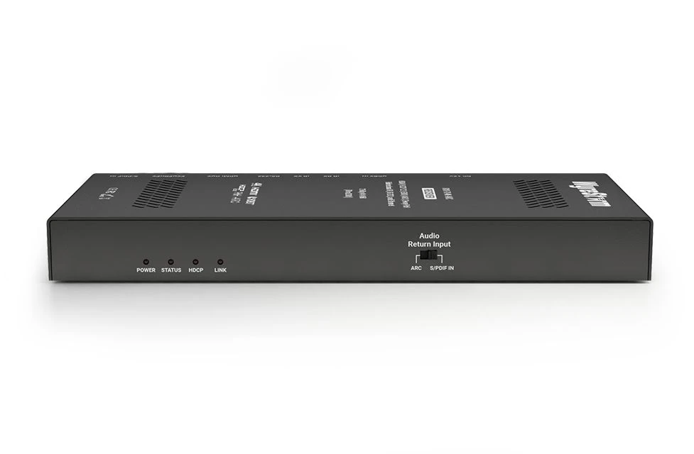HDBaseT приёмник HDMI2.0 по витой паре до 100 м (FullHD), до 70 м (4К@60 4:4:4), HDCP 2.2, ARC, де-эмбеддер аудио, двунаправленный ИК, RS-232, Ethernet, PoH.