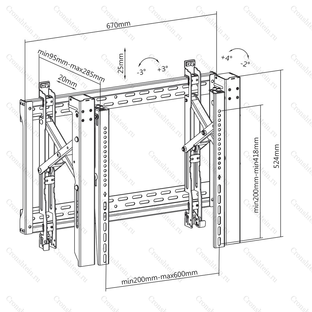 • Кронштейн имеет множество регулировок - включая глубину, высоту и наклон, позволяющих выбрать оптимальное и точное положение экрана