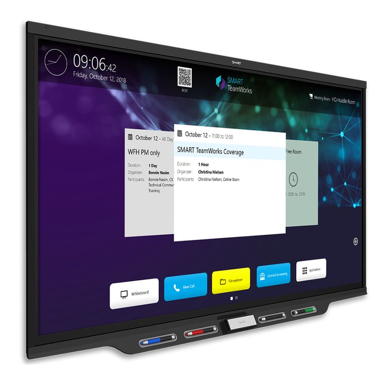 Панель SMART Board автоматически включается по датчику движения и отображает календарь встреч, дату и время.