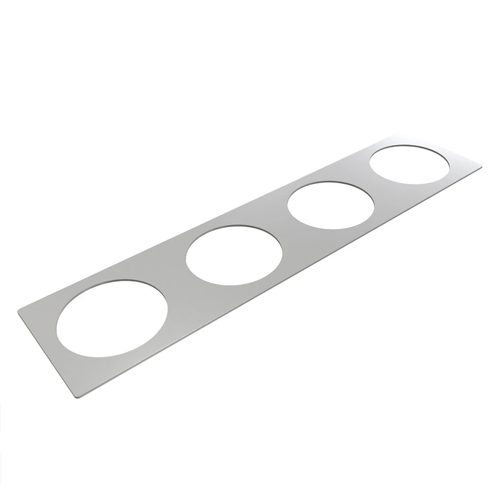 Прямоугольная рамка для установки 4 встраиваемых розеток. Габаритные размеры (ШxГxВ): 436,5х105х2 мм. Цвет серебристый.