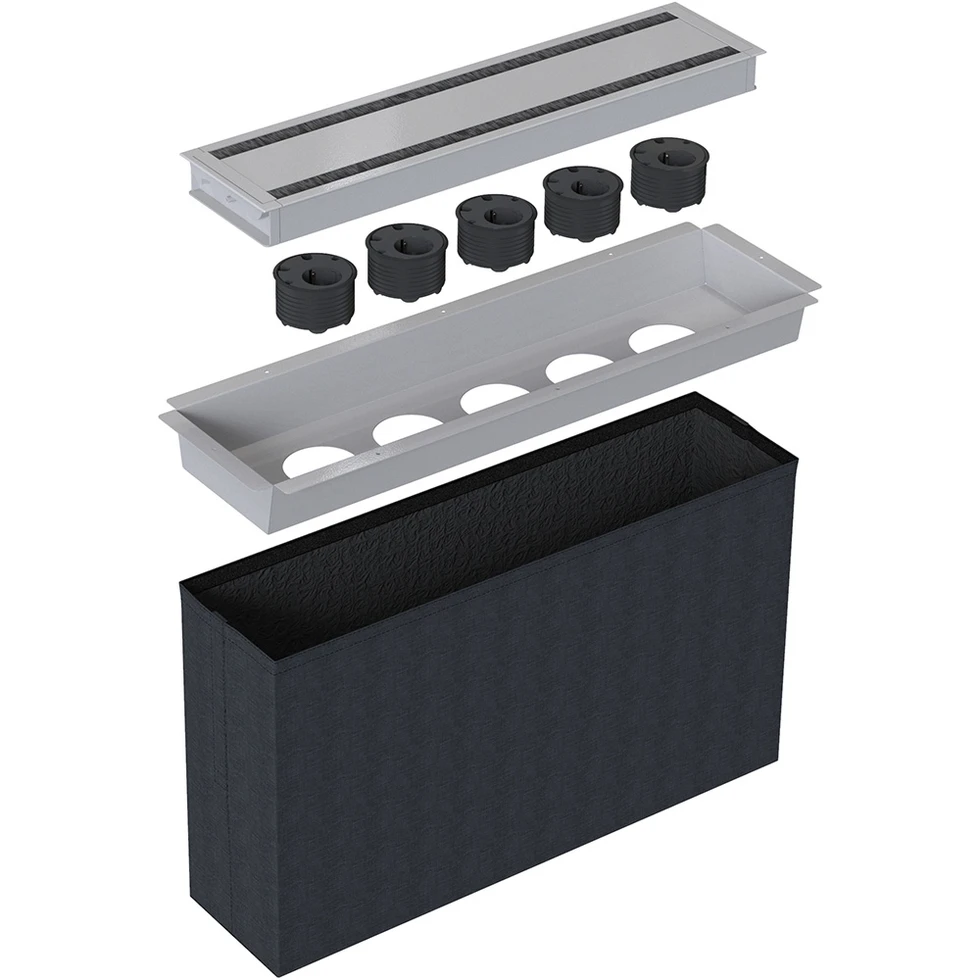 Розеточный блок серии Powerdot. Комплектация: крышка 935-TC60, короб для установки розеток 935-TP05, 5 встраиваемых черных розеток 935-PD10 серии Powerdot с 4 отверстиями для кабелей. Габаритные размеры (ШxГxВ): 720х220х64 мм. Размеры крышки (ШxГxВ): 612x148x28,1 мм. Монтажное отверстие: 603x141 мм. Цвет белый.
