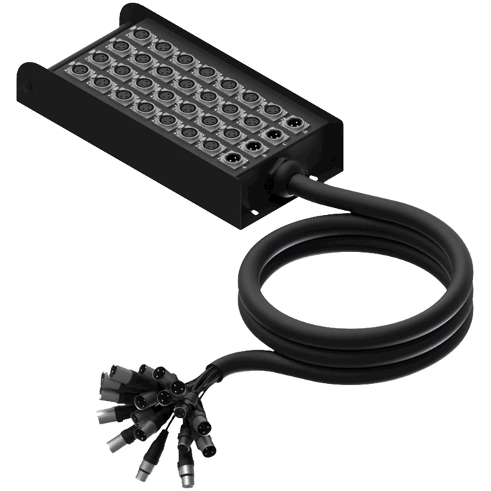 Сценический аудиомультикор с разъемами 28х XLR 3-pin (розетка), 4х XLR 3-pin (вилка) – 4х XLR 3-pin (розетка), 28х XLR 3-pin (вилка).