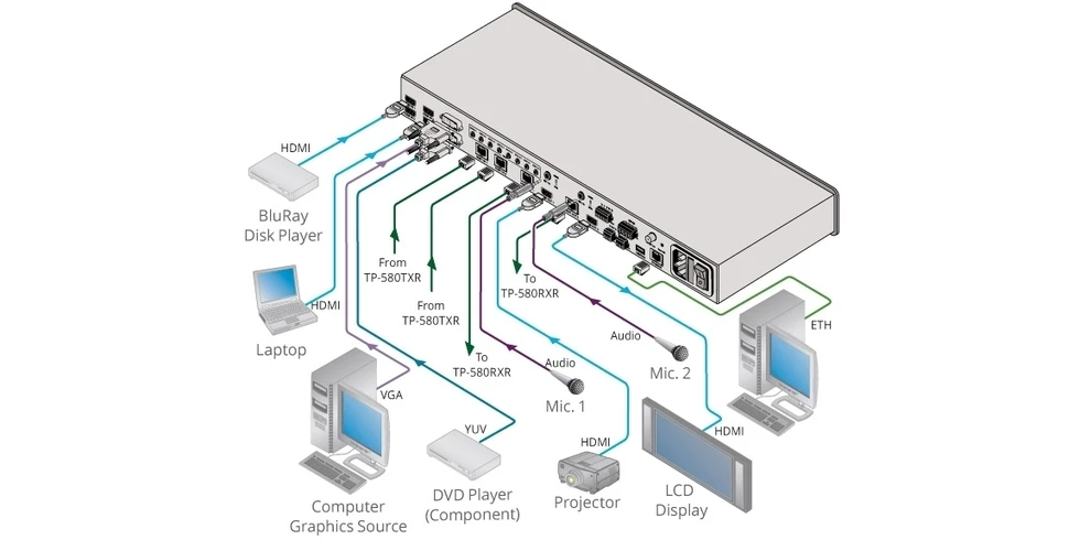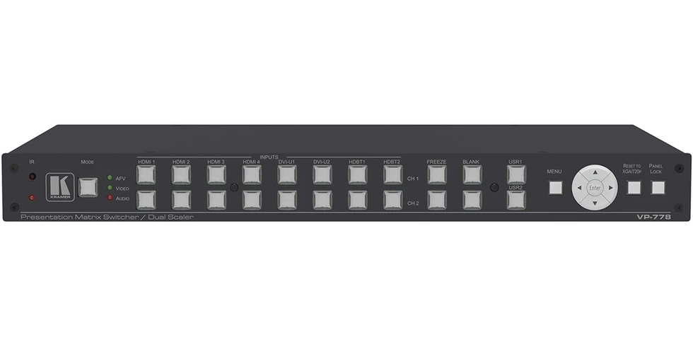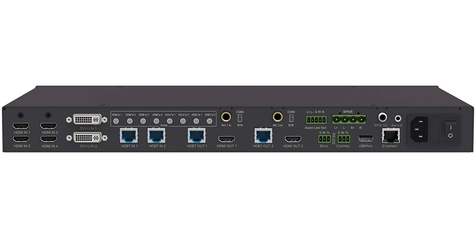 Сдвоенный масштабатор/ автокоммутатор 4 х HDMI, 2 х HDBaseT, 2 х DVI-U (VGA, CV, YUV), 8 стерео в 2 х HDMI, 2 х HDBaseT, стереоаудио; 4K/30 в полноэкранном режиме, PIP - 1080p. Люмакей и хромакей, настройка автопереключения. 2 микрофонных входа с усилителем мощности 2х10 Вт. Управление: ИК, RS-232, web-интерфейс.