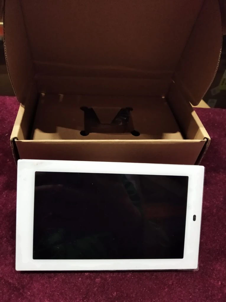 Настенная сенсорная панель 5.5" белого цвета, питание по кабелю Ethernet (PoE 802.3af), расположение на стене исключительно вертикальное.