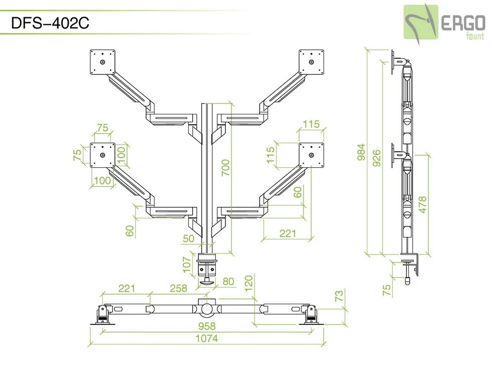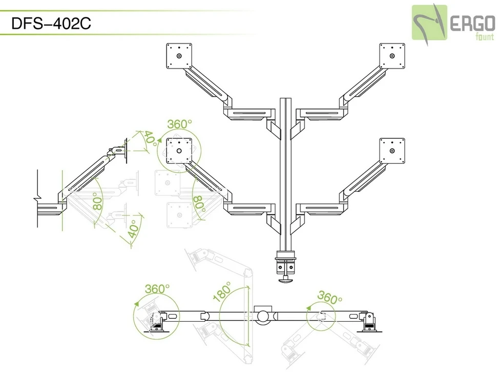 Шарнирное настольное крепление для 4-х мониторов с зажимом и кронштейном ERGO DFS-402C