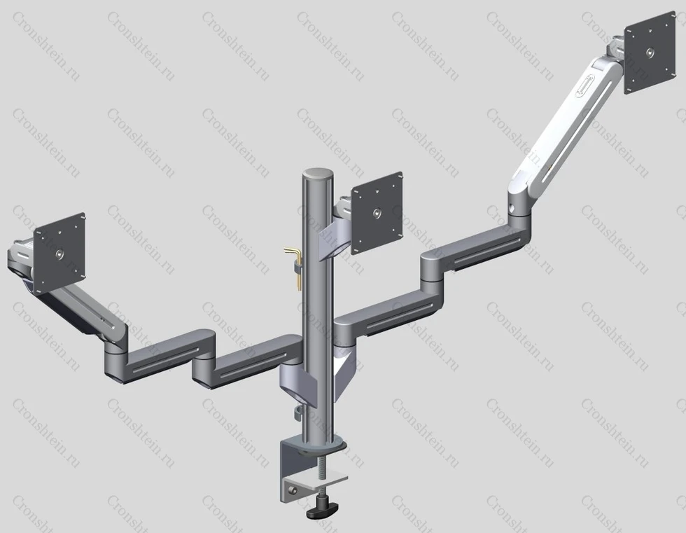 Шарнирное настольное крепление для трех мониторов до 24 дюймов. Доступна регулировка высоты в пределах 45 см, вращение на 360 градусов. VESA 75х75, 100х100. Используется крепление типа струбцина, не требующее сверления отверстий. Удобный кабель-канал. Максимальная нагрузка 25,5 кг.