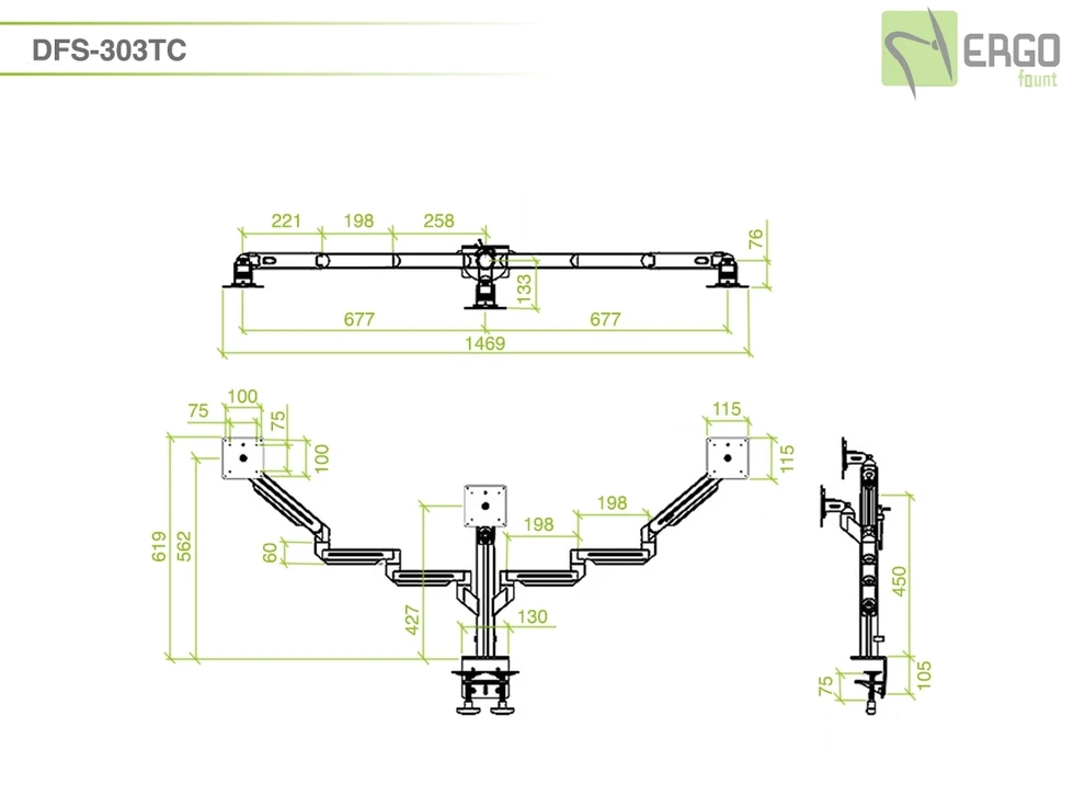Шарнирное настольное крепление с изменяемой высотой установки для 3-х мониторов с зажимом и кронштейном ERGO DFS-303TC