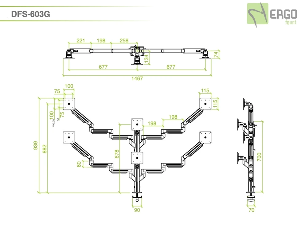 Шарнирное настольное крепление для шести мониторов до 24 дюймов в два ряда. Доступна регулировка высоты в пределах 70 см, вращение на 360 градусов. VESA 75х75, 100х100. Используется крепление типа втулка. Удобный кабель-канал. Максимальная нагрузка 51 кг.