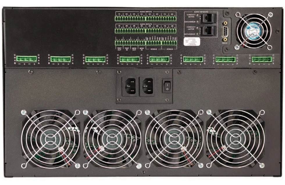 Шасси девятислотового усилителя мощности с DSP-процессором для системы оповещения GLOBALCOM, горячее переключение на запасной усилитель, входа локальные и по интерфейсу CobraNet, до 16 выходных зон.