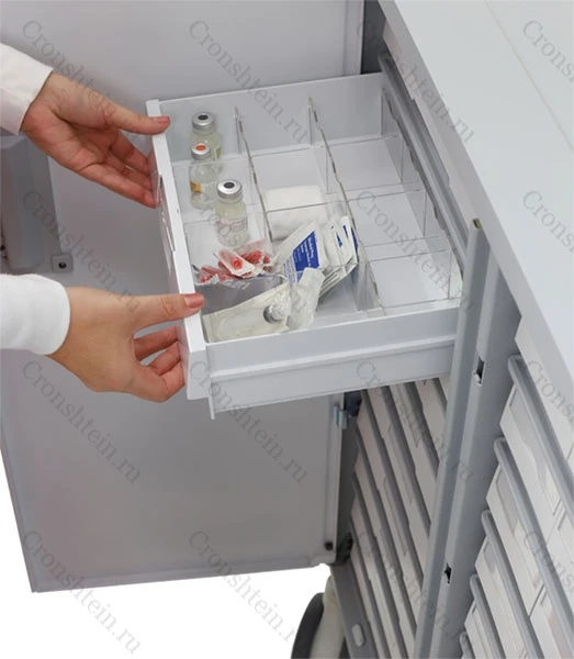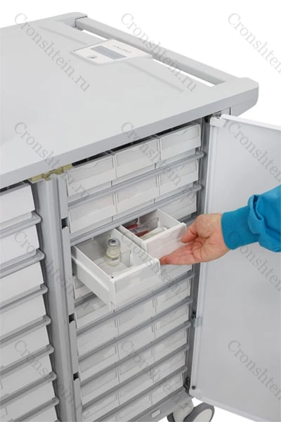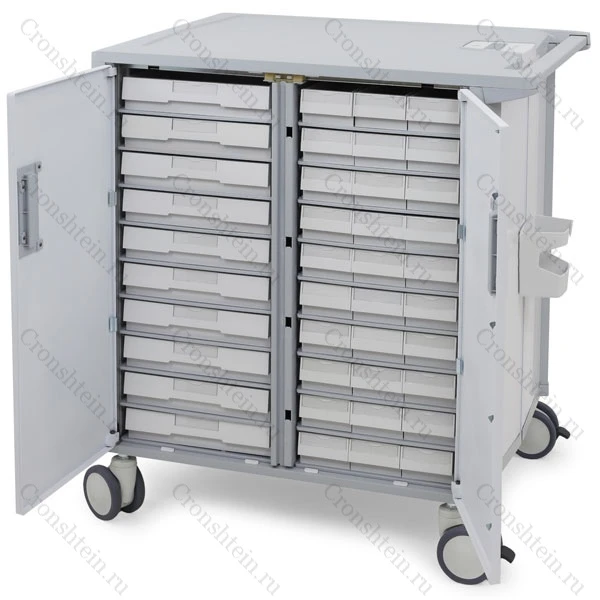 Тележка для медикаментов Style Wiew 24-421-062. Вмещает до 120 маленьких ящиков или 40 больших ящиков. Электронный замок. Работает в любой среде, в том числе образования, здравоохранения.
