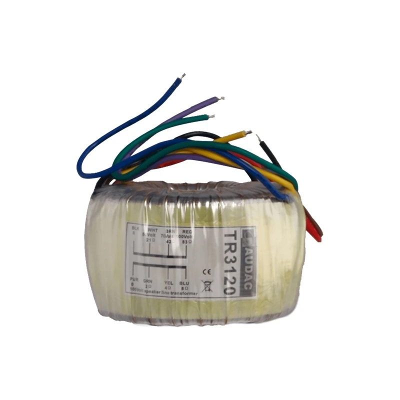 Трансформатор 120 Вт / (50/70/100 В, 2/4/8 Ом). Габаритные размеры: 90x65x90 мм. Выводы 200 мм.