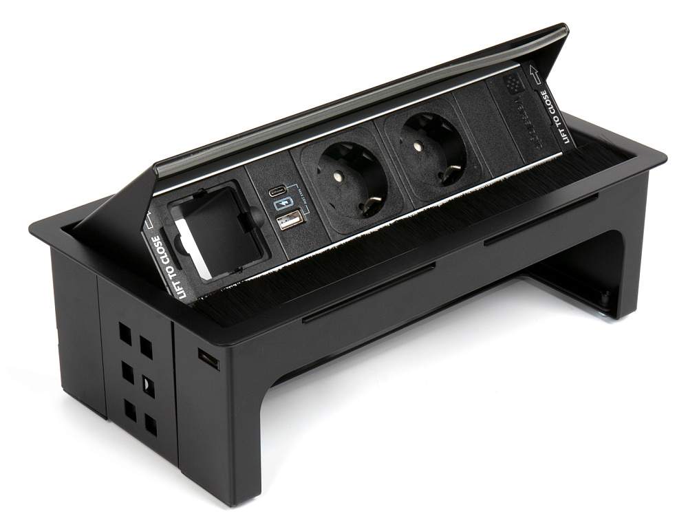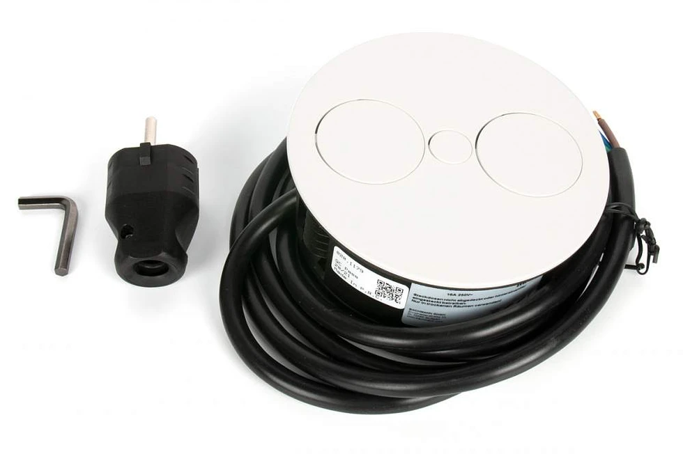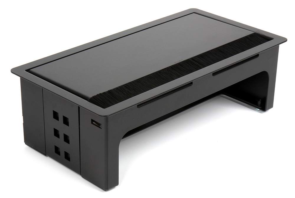 Встраиваемый блок наиболее компактное решение для пары встроенных розеток. Подходит как для встройки в столешницу тощиной 20-40мм, так и для врезки в дно навесного шкафа с доступом снаружи. Малая глубина врезки блока и компактная подводка питающего кабеля позволяет устанавливать даже в столешницу над выдвижным ящиком.