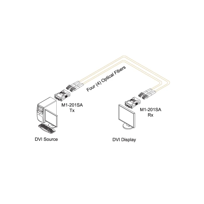 Удлинитель DVI-D Single Link интерфейса посредством 4-х оптоволоконных патч-кордов, автоматическое программирование EDID.