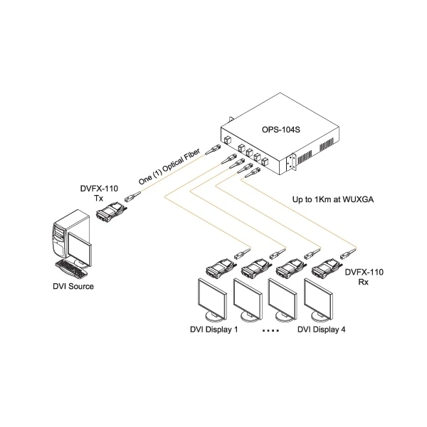 Удлинитель DVI-D Single Link интерфейса посредством одного многомодового или одномодового оптоволоконного патч-корда до 1500 м.