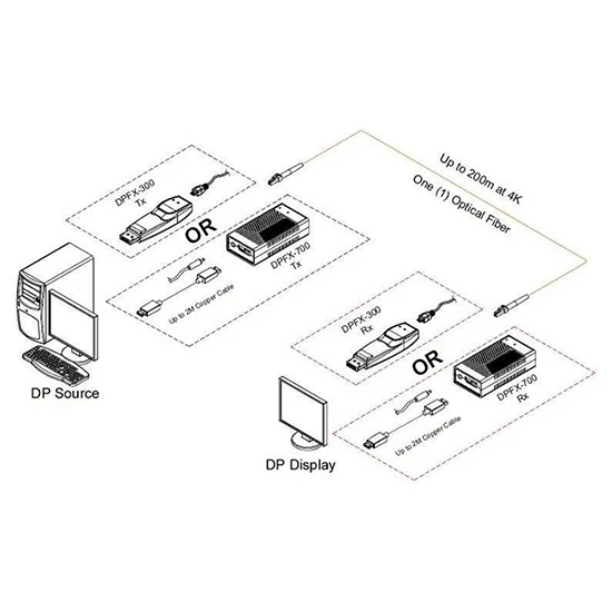 Удлинитель интерфейса DisplayPort 1.2 (4096x2160/60) с DP++ и I?C по одному многомодовому оптоволоконному патч-корду OM3 с разъемами LC длиной до 200 м. Совместим с DPFX-300-TR.