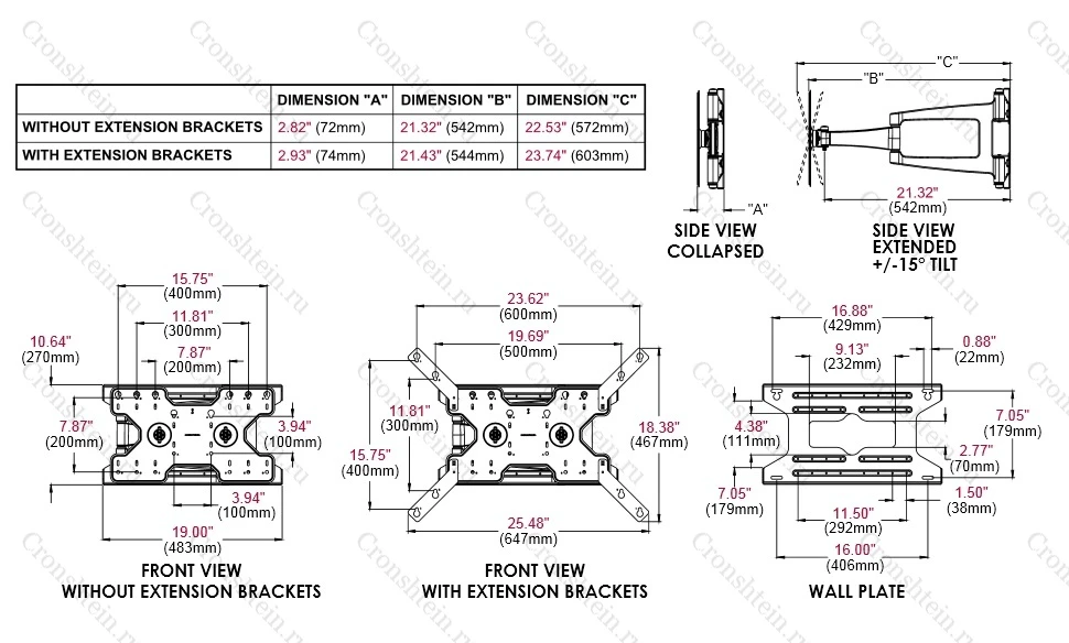 PA761 - универсальное шарнирное, настенное крепление для LСD и PDP панелей 37-75''. VESA (до 600х400). От стены 74-544мм. Поворот: ±90°. Наклон: +15°.. -15°. Габариты: 647x467x(74-544)мм. Макс. нагрузка 48кг. Цвет черный.