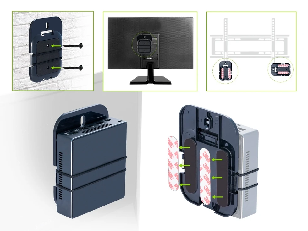 Универсальный кожух для медиаплеера ERGO BAS-04. арт 7352. Предусмотрено несколько способов монтажа: к VESA-адаптеру, к настенному креплению ТВ, напрямую к стене, напрямую к задней крышке ТВ. Имеет прорезиненную защитную подушку.