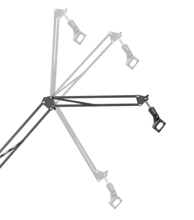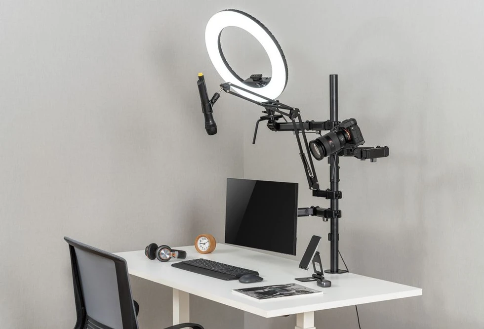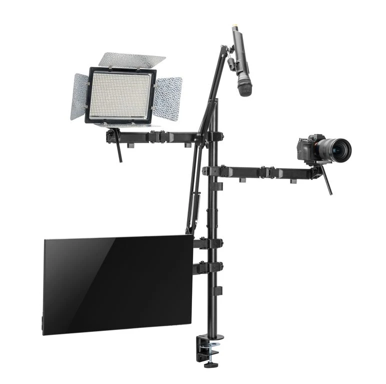 Универсальный настольный кронштейн для создания собственной студии. Позволяет эргономично разместить одновременно 4 устройства: монитор, камеру, микрофон и освещение.