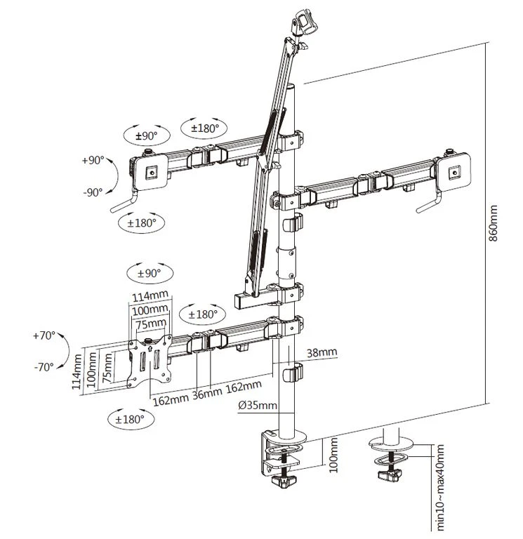 Кронштейн настольный для студии 4 в 1, VESA макс. 100х100, нагрузка до 9 кг для монитора и до 7 кг для камеры и освещения. Кронштейн для микрофона можно использовать как в сборе, так и отдельно.