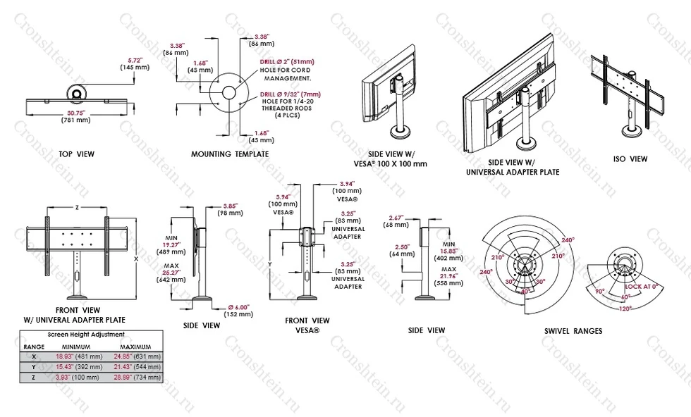 HP450 - универсальный настольный кронштейн для панелей с диагональю экрана 32'' - 52''. Кронштейн жестко фиксируется на столешницу и позволяет разворачивать панель на 360° по горизонтали с фиксированными углами 40°, 60°, 120°, 180°, 210° и 240°, а также регулировать положение по высоте. Предусмотрен внутренний кабель-канал. Максимальная допустимая нагрузка - 68 кг, цвет черный, порошковая эмаль. Габаритные размеры - 781 х 673 х 152 мм. Секретный крепеж.