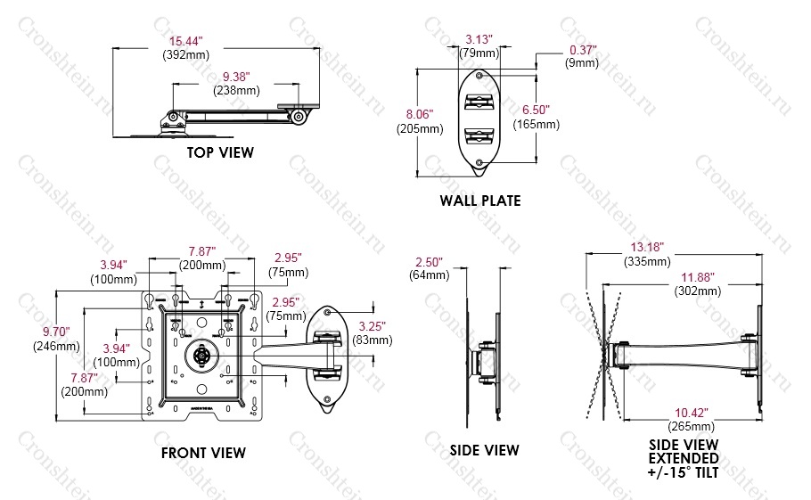 • Регулируемое расстояние от стены - от 64 мм до 302 мм