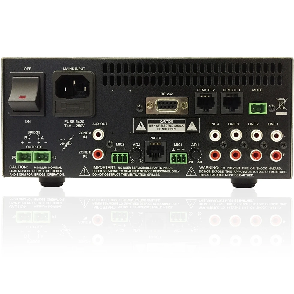 Усилитель-микшер, 2х70 Вт – 100 В/4 Ом. Входы: 2 х балансных (24 В), 4 х 2хRCA, RJ45 (пейджинг MPAGE4). Управление по ИК, RS-232, панели WPm.