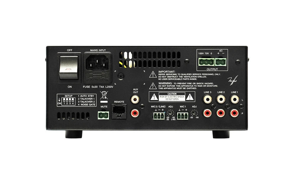 Усилитель-микшер на 120 Вт – 70/100 В/4 Ом и медиаплеером (USB, карты SD/SDHC). Входы: 1 х Mic (15 В), 1 х Mic/Line, 3 x Line, mute. Управление с панели WPm.