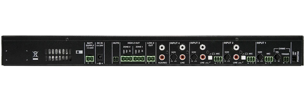 Усилитель мощности 1/2 зоны 95 Вт – 70/100 В/4 Ом. Входы: 1 х Mic (24 В), 2 x Mic/Line, 1 x Line, mute.