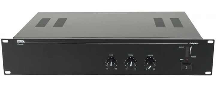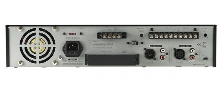 Усилитель мощности 240.360 Вт – 8 Ом, 50/70/100 В. Вх: 2хXLR, 2х(2хRCA), 1хКлеммный блок (телефонный пейджинг). Регулировка тембра.