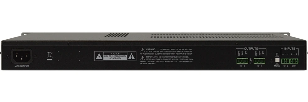Усилитель мощности 2x142 Вт – 70/100 В. Защита, отключаемое энергосбережение, переключение стерео/моно. Балансные входы.