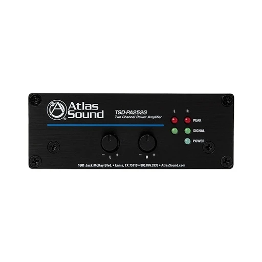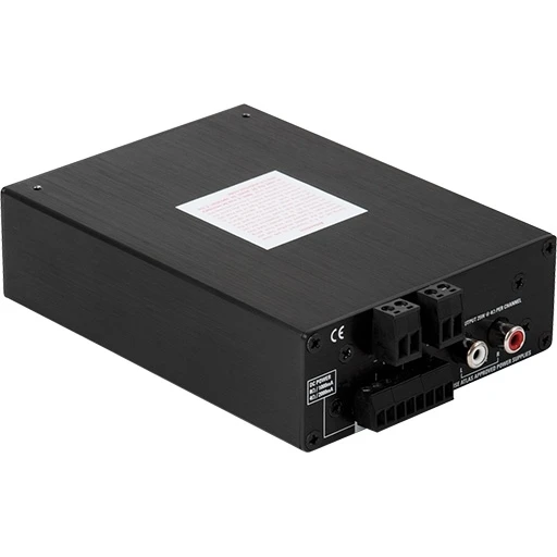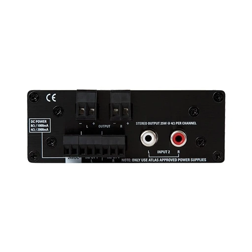Усилитель мощности 2х25 Вт – 4 Ом, 1х50 Вт – 8 Ом, балансный/ небалансный вход, подключение в «мост». Габаритные размеры: 381х100х70 мм. Блок питания 24 В приобретается отдельно.
