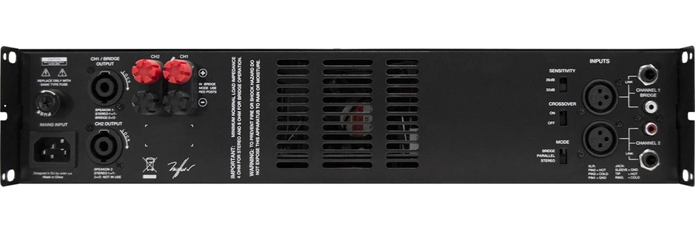 Усилитель мощности 2x280 Вт – 4 Ом, 2x200 Вт – 8 Ом, 1х560 Вт – 8 Ом. Отключаемый кроссовер 150 Гц, защита. Режимы: мостовой, параллельный, стерео. Балансные входы.