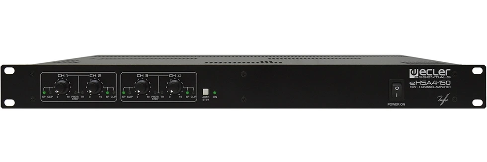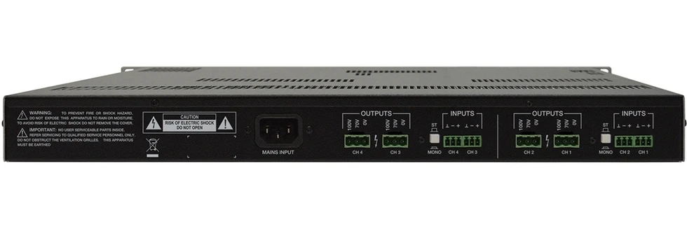 Усилитель мощности 4x140 Вт – 70/100 В. Защита, отключаемое энергосбережение, переключение стерео/моно. Балансные входы.