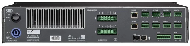 Усилитель 4x1600/800 Вт - 4/8 Ом с контроллером: предустановки для всех АС d&b, пароль, парам.экв., delay, AES/EBU, Ethernet, GPIO, 2U, вес 10,6кг. Разъем Phoenix.