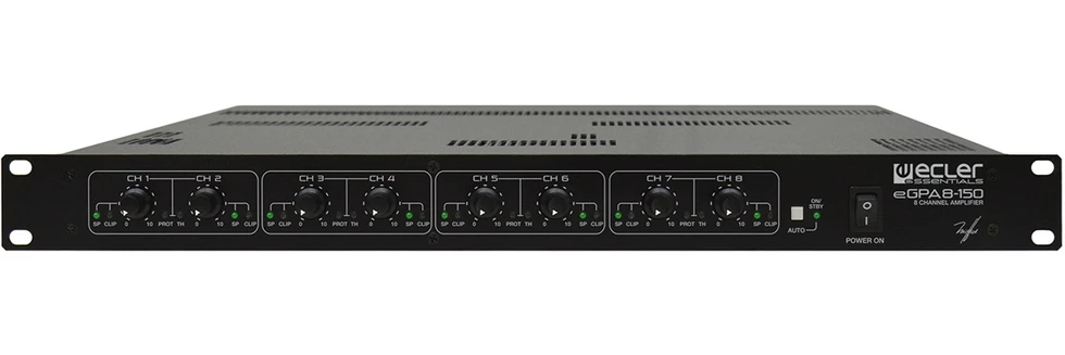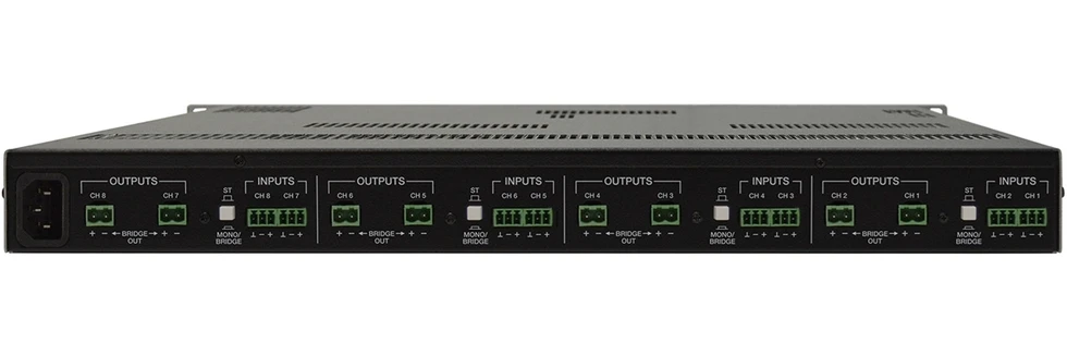 Усилитель мощности класса D 8x144 Вт – 4 Ом, 8x74 Вт – 8 Ом, 4х290 Вт – 8 Ом. Отключаемое энергосбережение, защита. Режимы: мостовой, параллельный, стерео. Балансные входы без выходов.
