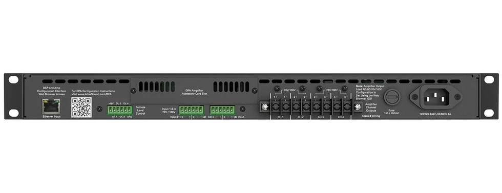 Усилитель мощности с DSP-процессором. 4x150 Вт – 4 Ом, 4x75 Вт – 8 Ом, 2х300 Вт – 70/100 В, веб-интерфейс. Высота 1U.