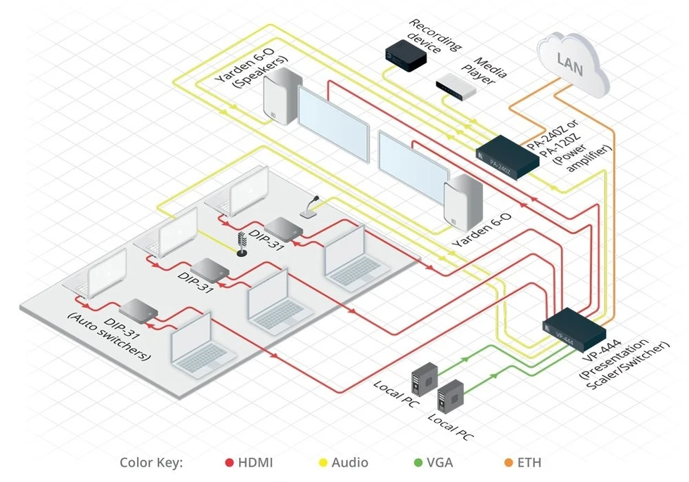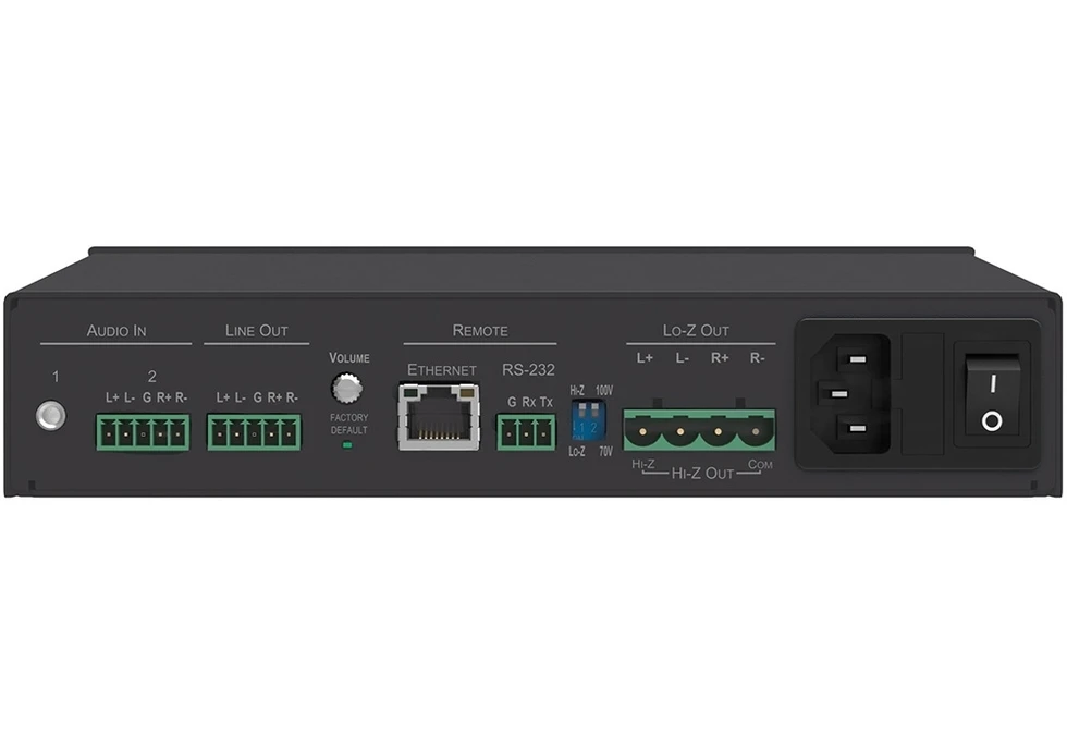 Усилитель мощности с трехполосным эквалайзером и ВЧ-фильтром, балансные и небалансные входы, 2x60 Вт – 4 Ом/8 Ом, 120 Вт – 70/100 В, управление по RS-232 или IP (web-интерфейс).