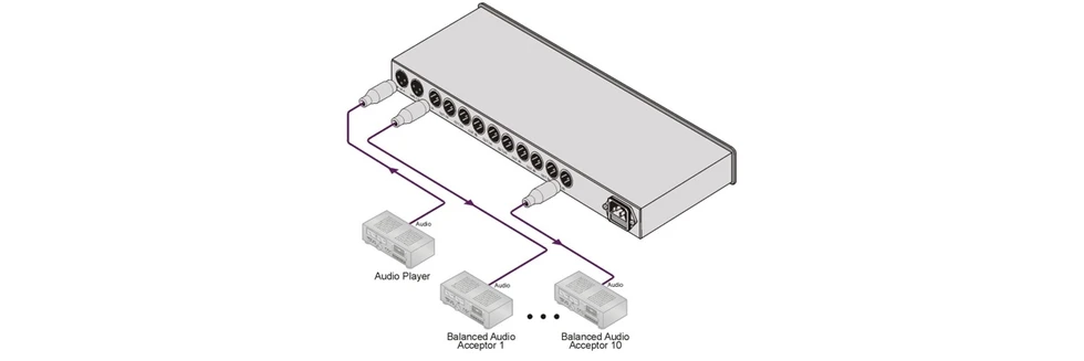 Усилитель-распределитель 1:10 балансных звуковых моносигналов (разъемы XLR) c регулировкой уровня, 100 кГц.